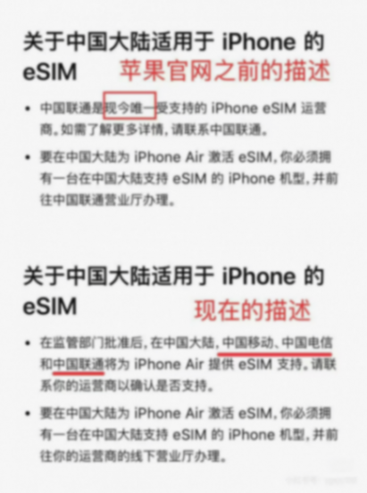 让小雷惊喜的是,就在我梳理这些运营商动态的时候,又刷了遍 iPhone Air 的官网页面,发现底下关于 eSIM 支持的描述居然也更新了。之前明写的 “仅有中国联通为本产品提供 eSIM 支持”,现在直接改成了“中国移动、中国电信和中国联通将为本产品提供 eSIM 支持”。