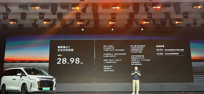 9月10日,定位为5门7座MPV的魏牌高山7发布了预售价格,新车预售价为28.98万元,同时,现场公布了高山8福祉版车型的上市价格,新车售价为34.98万元。在购车优惠政策方面,预定高山7的用户可享受至高30000元置换补贴,26000元城市NOA和高速NOA功能终身免费等政策。