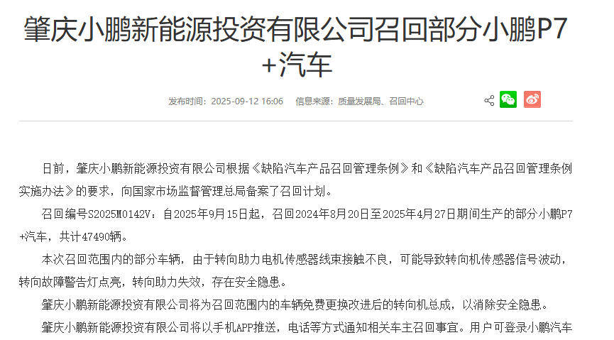 涉及车型为2024年8月20日至2025年4月27日期间生产的部分小鹏P7+汽车,共计47490辆。而召回原因则为由于转向助力电机传感器线束接触不良,可能导致转向机传感器信号波动,转向故障警告灯点亮,转向助力失效,存在安全隐患。