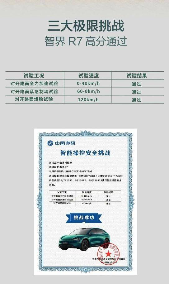 其次是爆胎场景,驾驶员在开车的时候,其实很怕爆胎,因为爆胎容易导致车祸,甚至出现车毁人亡的惨剧。其实我们在开车之前,就应该关注轮胎的状态,毕竟轮胎是唯一一个与地面直接接触的部件。但难免会有意外发生,比如路面上突然出现的障碍物,如果视线良好且距离足够的话还是很容易避免的,但如果遇到的是钉子等细小尖锐物体,或者距离不足的话,很容易发生爆胎现象。爆胎之后的车辆通常很难控制,容易产生偏移现象。新款智界R7的爆胎稳定干预控制能够在0.7秒内介入,能够减少因爆胎产生的偏移现象,让驾驶者能够更加安全地操控车辆。在此次测试中,新款智界R7能够从120km/h刹停。