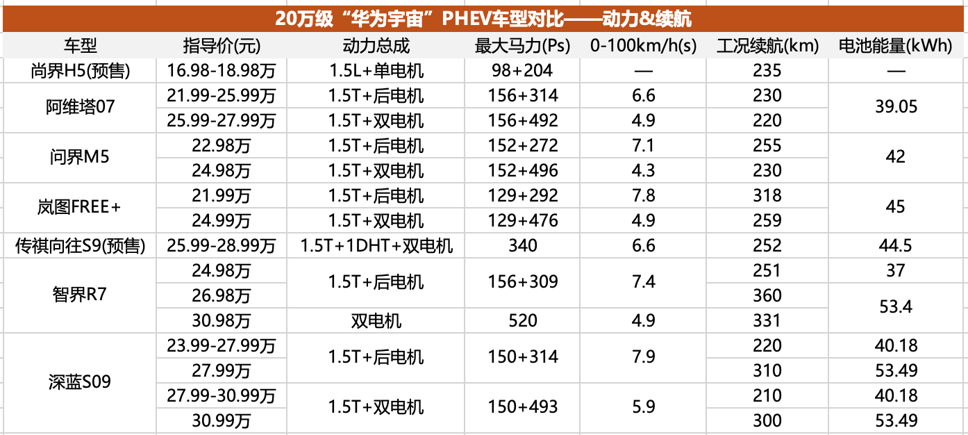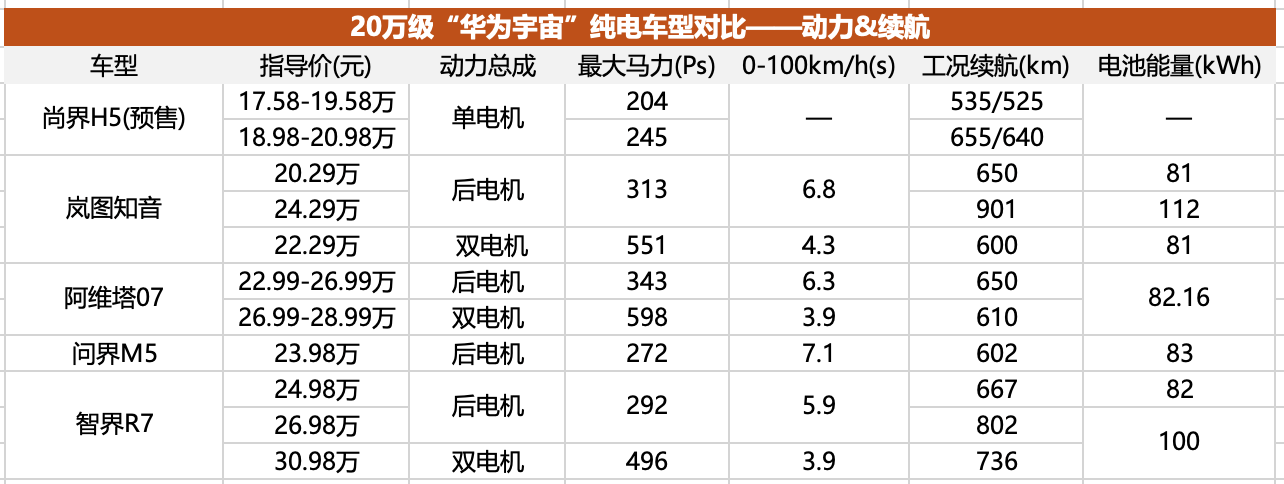 首先看纯电车型,除了岚图知音为纯电SUV外,尚界H5、阿维塔07、问界M5和智界R7均有纯电和增程两种版本,这些车型在动力、续航方面的差异还是比较明显的。