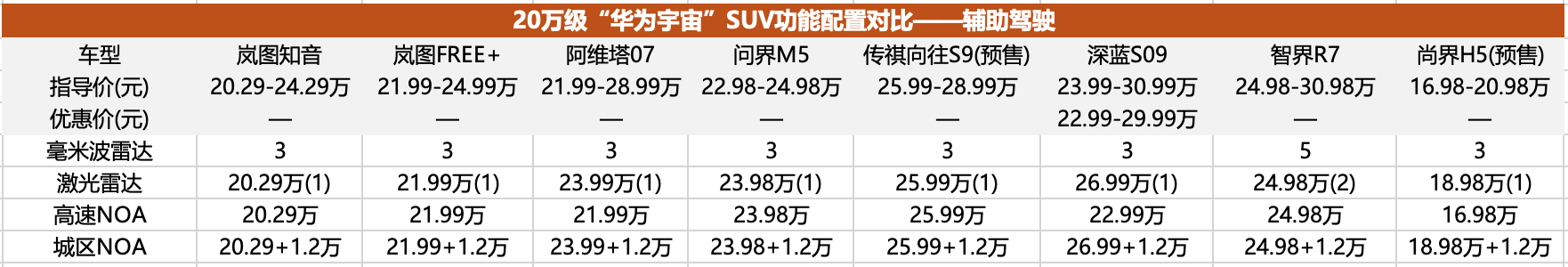 最后就是车型类别,当前搭载华为乾崑智驾ADS 4的车型绝大多数都是SUV,尤其是20万元左右这个价位,SUV车型已经多到让人有些眼花,所以今天加入对比的,也以SUV为主。
