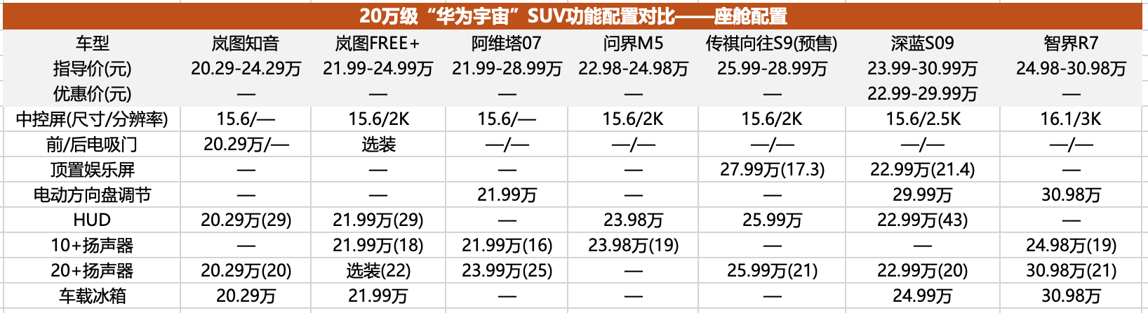 配备车载冰箱的车型有4款,不过智界R7只有30.98万顶配才给到,深蓝S09的门槛是24.99万,岚图知音和FREE+则全系标配,门槛最低。