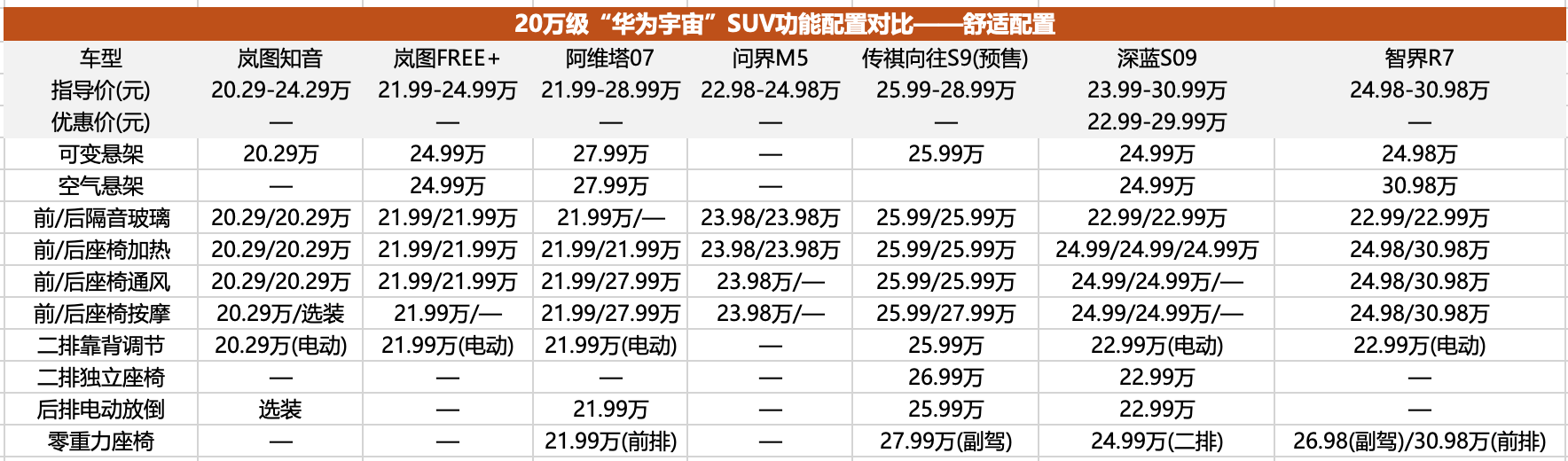 最后是零重力座椅,其它配置比较突出的岚图知音和FREE+都全系没有配备,阿维塔07是唯一标配、且在前排配备两套零重力座椅的车型,此外深蓝S09在24.99万的配置上也给到了二排两套零重力座椅,向往S9和智界R7的门槛则都超过了25万。