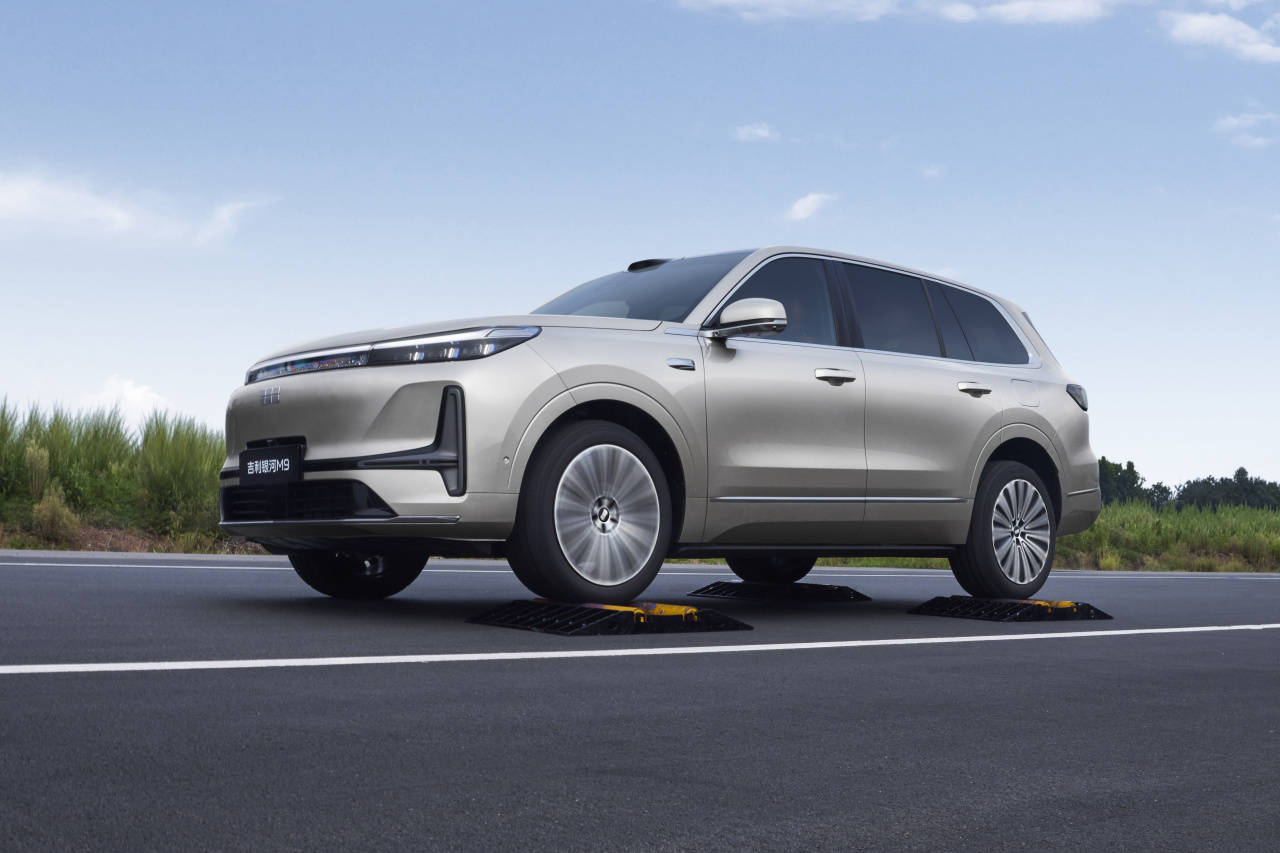 底盘部分,银河M9全系标配前双叉臂独立悬架+后五连杆独立悬架,除了100km版本车型配备可变阻尼减震器,顶配车型可选双腔闭式空气悬架,整个底盘悬挂交给了路特斯团队调校。