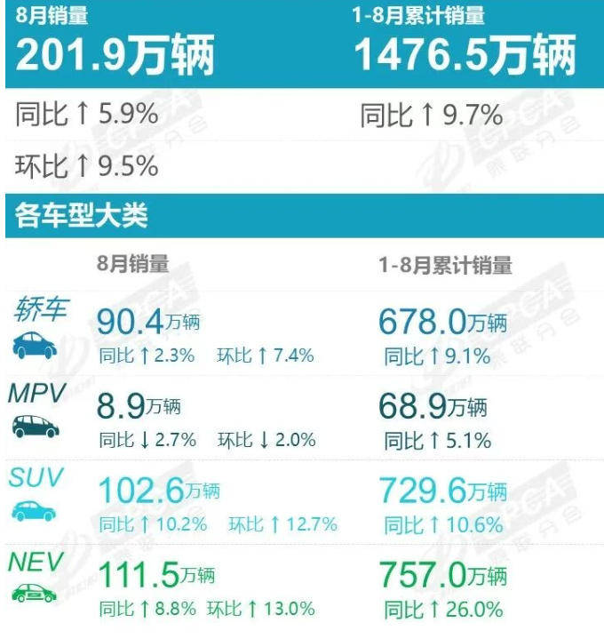 【8月车企零售销量排行出炉,比亚迪、吉利、长安占据前三】日前乘联会公布了8车企销量情况,数据显示,8月份车市整体销量继续上涨,当月国内狭义乘用车市场零售销量达201.9万辆,同比增长5.9%,环比增长9.5%;1-8月份累计销量1476.5万辆,同比增长9.7%。