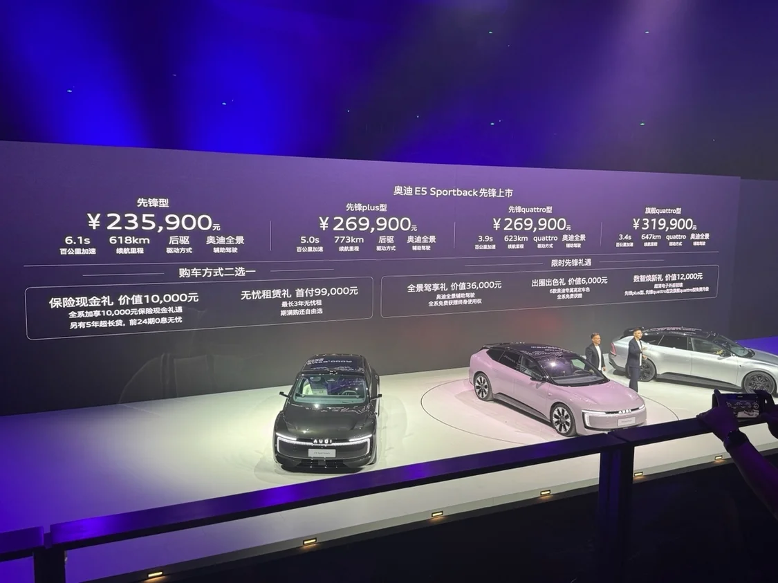9月16日,上汽奥迪在广州大湾区体育中心举办发布会,宣布新车奥迪E5 Sportback正式上市,新车共推出4款车型,售价区间为23.59-31.99 万元。