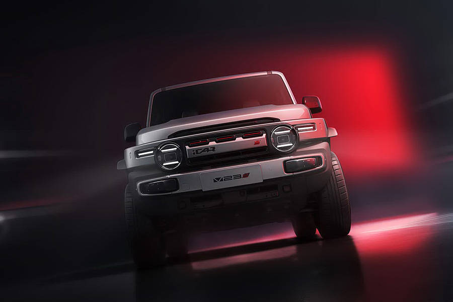 具体来看,iCAR V23S依旧是“方盒子”造型,但在细节上加入了一些运动元素。例如前格栅的三孔造型中间内嵌了红色装饰条点缀,在格栅盖板的左侧增加了一个“S”标志,彰显出与众不同的运动属性。