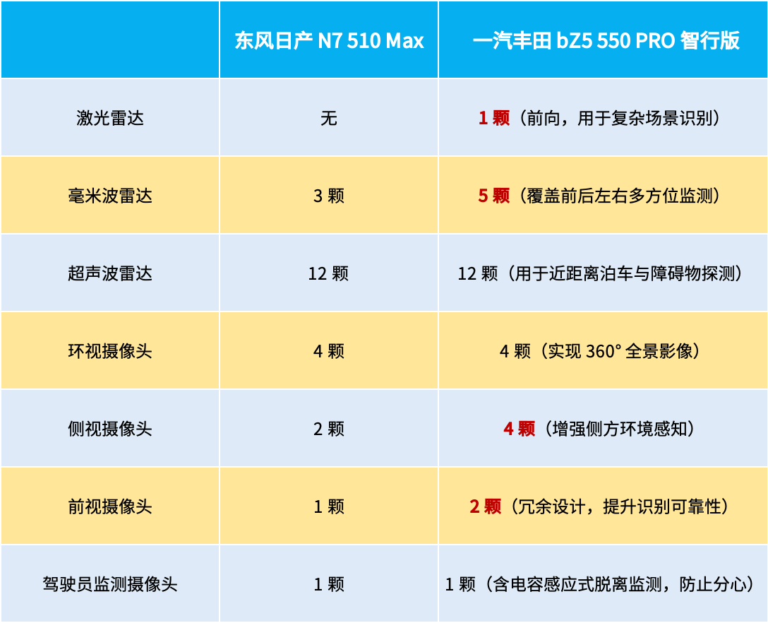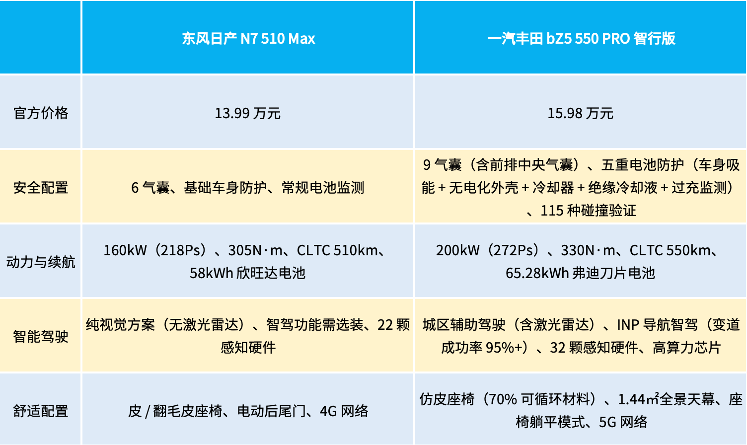 在新能源汽车市场,『安全』与『智能』已成为用户购车的两大核心考量,但并非所有『安全配置』与『智能功能』都能真正落地为用户价值。有的品牌专注于核心场景的技术深耕,有的则沉迷于非核心功能的『噱头式堆砌』。一汽丰田bZ5 550 PRO 智行版与东风日产N7 510 Max在这一维度的差异,堪称『真硬核』与『伪优势』的鲜明对比。