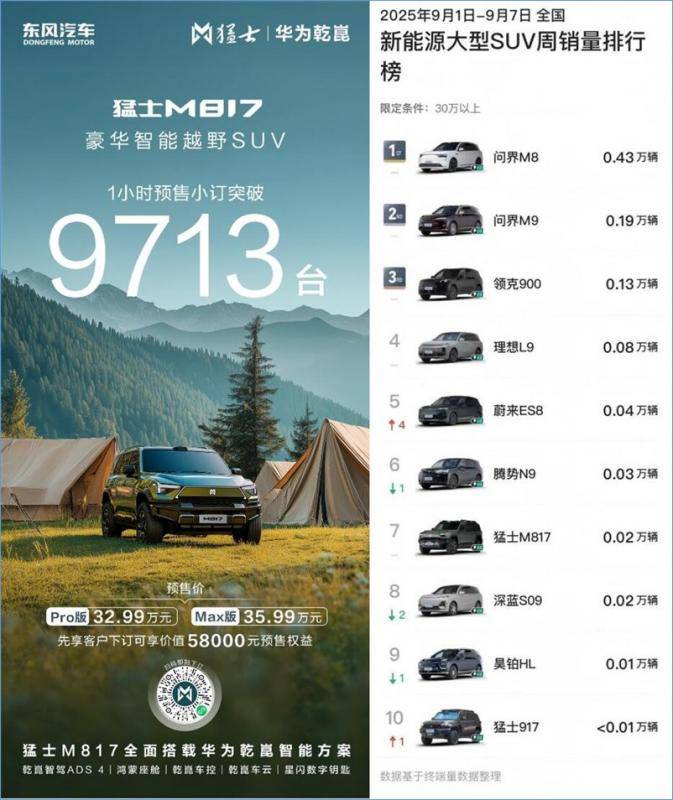 2025年7月17日,猛士M817在武汉开启预售,取得1小时9713台的预售战绩。在预售发布会上,华为智能汽车解决方案BU CEO靳玉志也到现场站台助力;