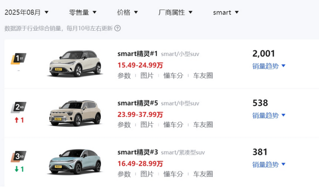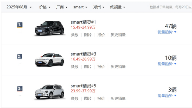 后续查询易车销量数据库发现,单店个位数的销量基本属实,因为8月份smart在郑州的销量只有60辆,其中精灵#1占47台,定价23.99万-37.99万元的精灵#5仅卖出3台。