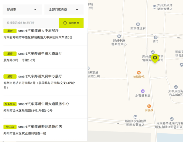 打开smart汽车官网查询,显示其在郑州现有三家展厅、一家快闪店和一家服务中心。可见销售所言不虚,smart在郑州的经营尚未陷入绝境。
