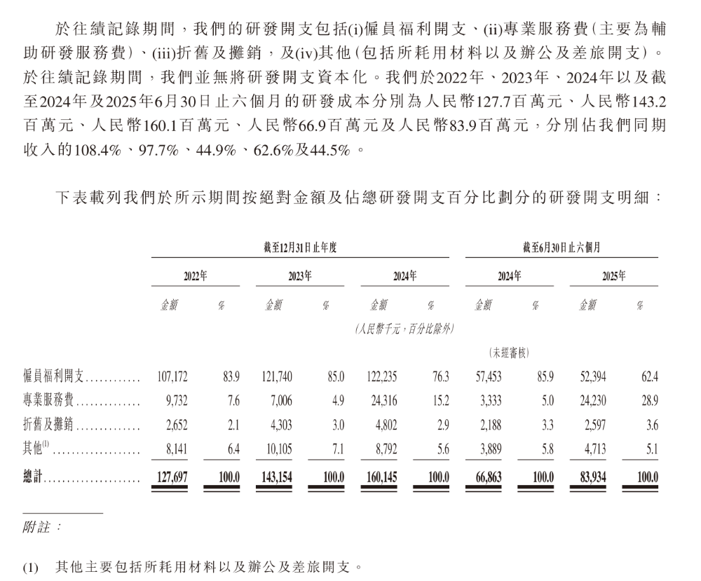 研发方面,魔视智能于2022年至2024年的研发开支分别为人民币1.277亿元、1.432亿元和1.601亿元,分别占同期总收入的108.4%、97.7%、44.9%,2025年上半年为人民币0.839亿元(8393万元),占同期总收入的44.5%。