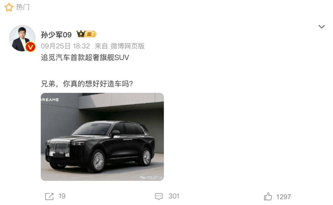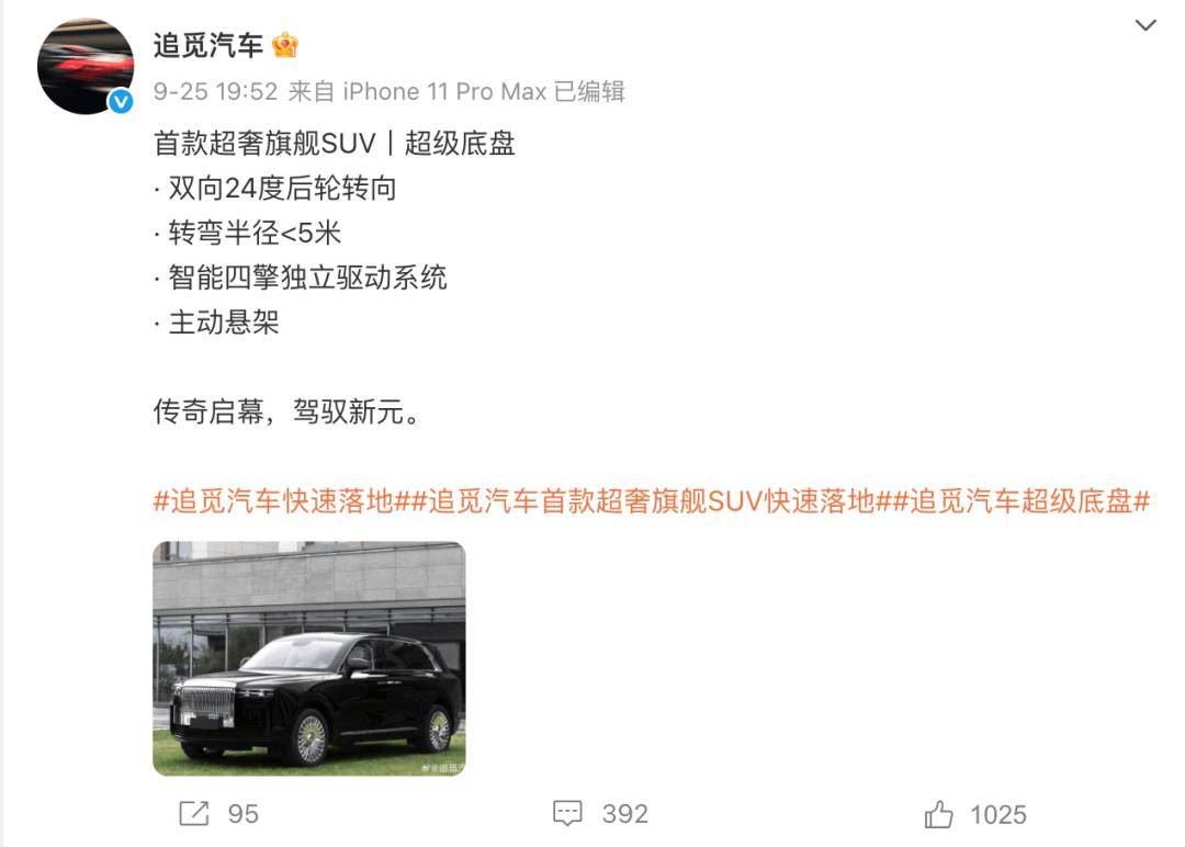 9月25日,追觅汽车发布首款SUV车型官图,据追觅科技方面介绍称,这款旗舰SUV将对标劳斯莱斯库里南。众所周知,劳斯莱斯库里南是劳斯莱斯的首款SUV,厂商指导价691-745万元,所以追觅首款SUV的最终售价也同样不菲,起码也是百万级别的定价。
