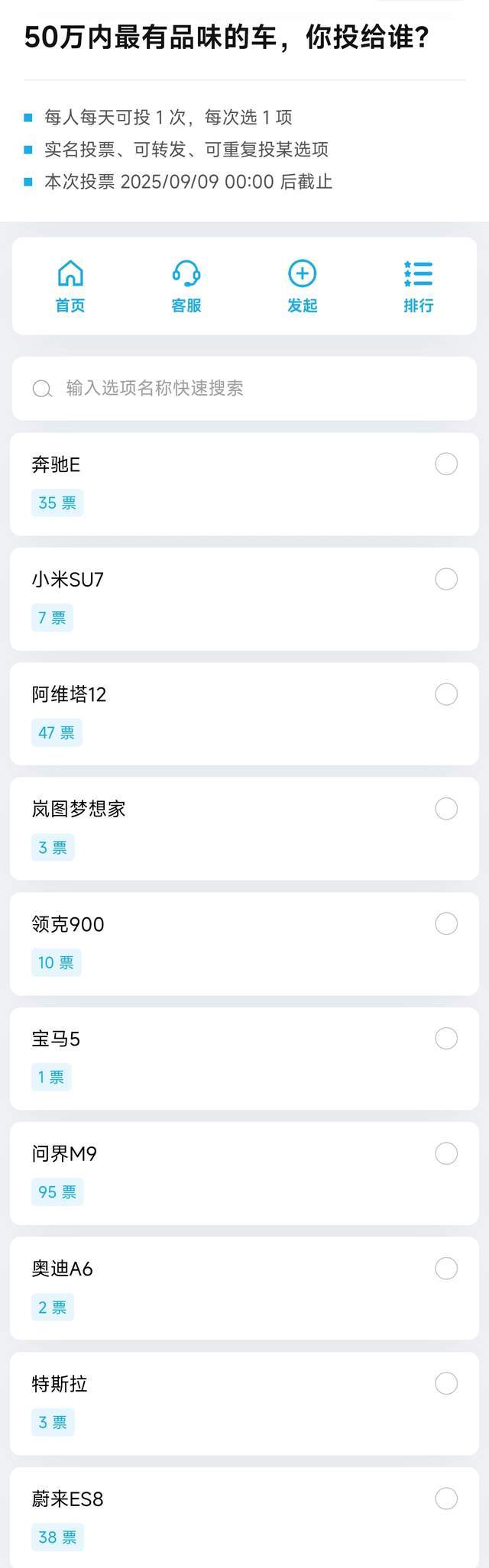 这次调查集中在老图的车友qun内,老图粉丝中新能源车主居多,但是总是如此,奔驰E级依然获得了35票的高票,第一名是可投车型中价格比较贵的问界M9,阿维塔12的获票倒是有点意外,超过了价格更贵的蔚来ES8。
