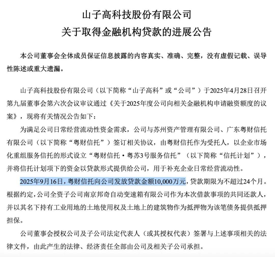 回复官方虽然较为模糊,但在今年9月,广东粤财信托有限公司曾向山子高科发放贷款高达一个亿,山子高科全资子公司南京邦奇自动变速箱有限公司为共同还款人,并以其名下工业用地的土地使用权及地上建筑物提供抵押担保。