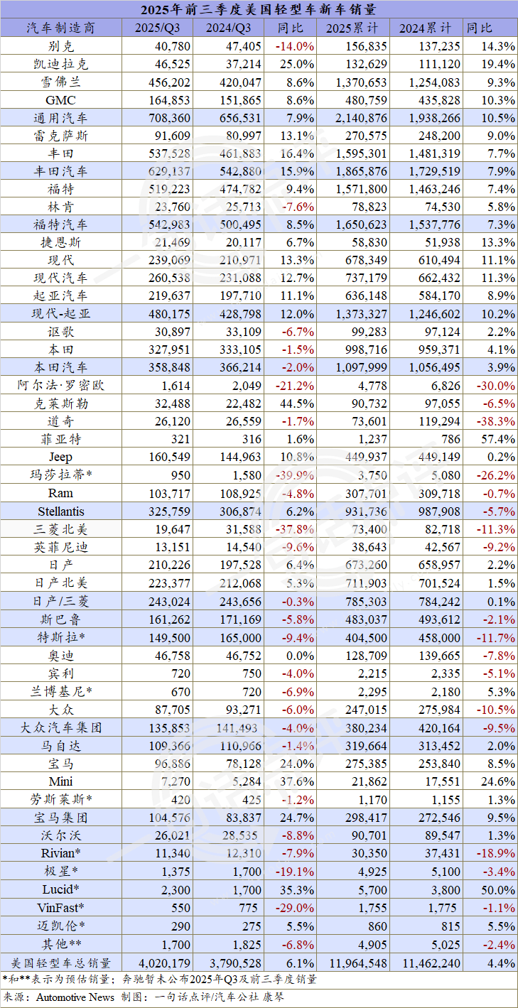 虽然9月和三季度美国整体市场走势良好,但从各家车企们的表现来看,却依旧是喜忧参半,排名靠前的车企中只有四家三季度和前三季度的同比均为正。