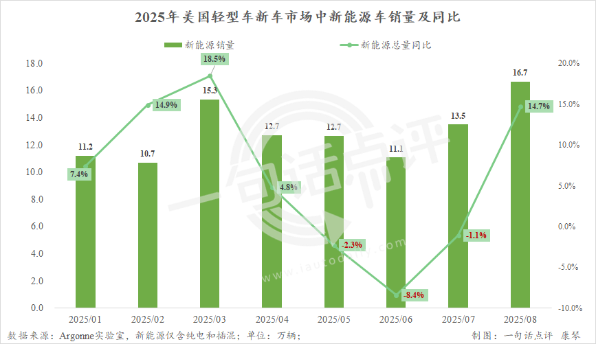 根据Argonne实验室的数据,近年来美国电动车市场的季度销量仅在2023年四季度、2024年三季度和四季度超过40万辆,其中去年四季度是历史最高值达到43.2万辆。由此可知,即便达不到45万辆,只要9月的销量高于12.7万辆就能刷新季度的历史最高纪录。
