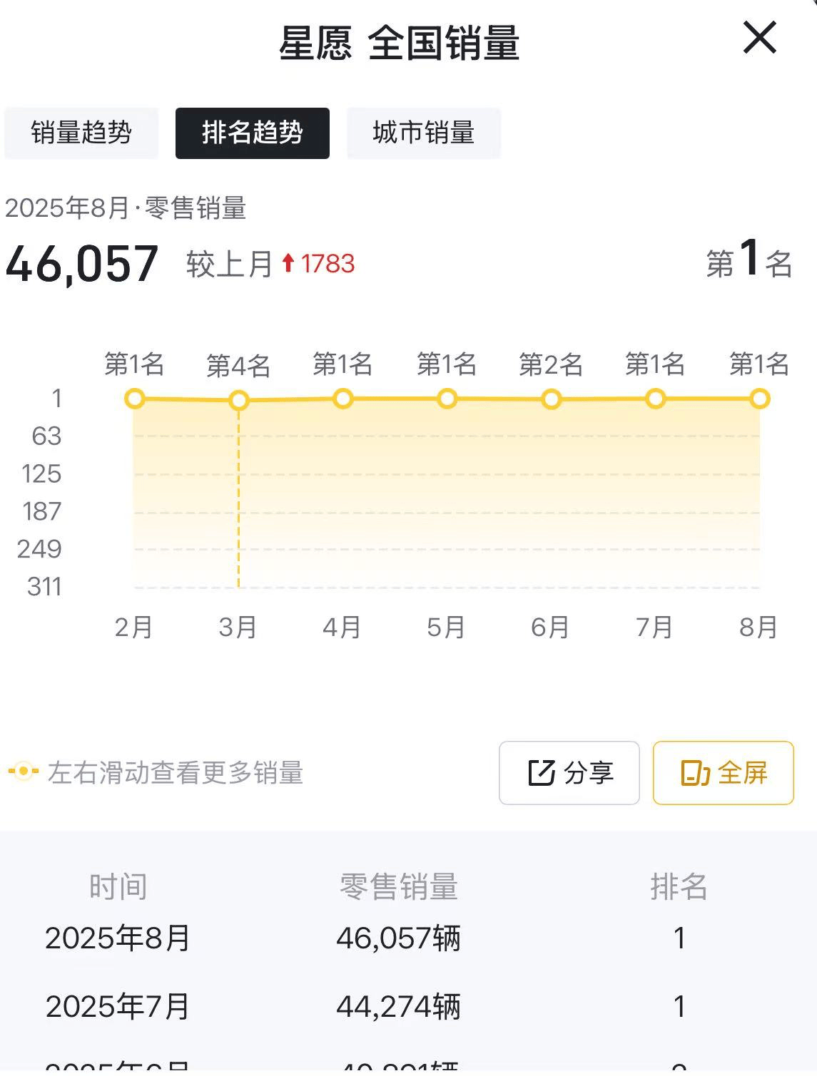 更令业界震惊的是,星愿不仅在小车市场所向披靡,更在全品类乘用车市场中展现出强大竞争力。截至2025年8月,星愿累计销量已超28万辆,市场份额高达14.43%,力压特斯拉Model Y,连续五个月稳居全国乘用车全品类销冠。