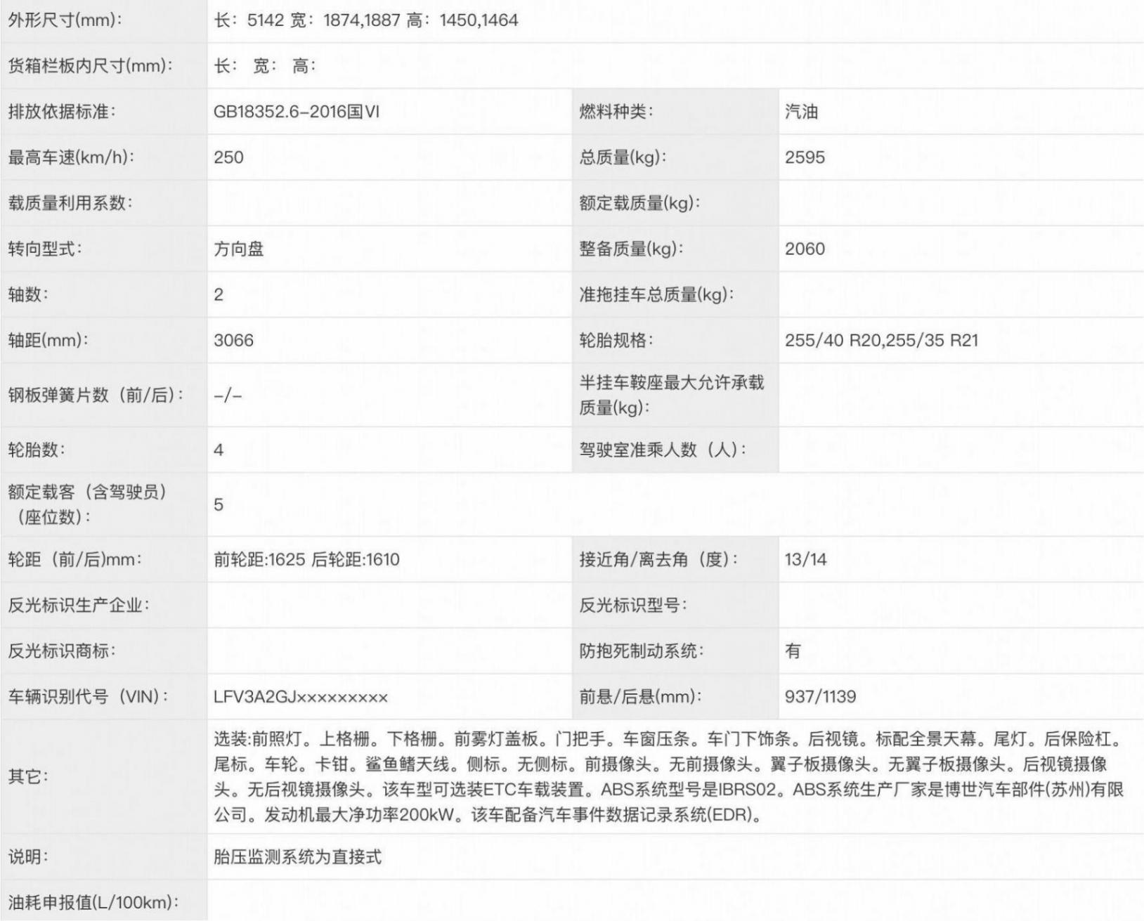 再看车身尺寸,该车长宽高为5142×1874(1887)×1450(1464)mm,轴距3066mm,对比现款提升了不少,特别是车长与轴距,各增加9.2厘米和4.2厘米,相当的宽敞。