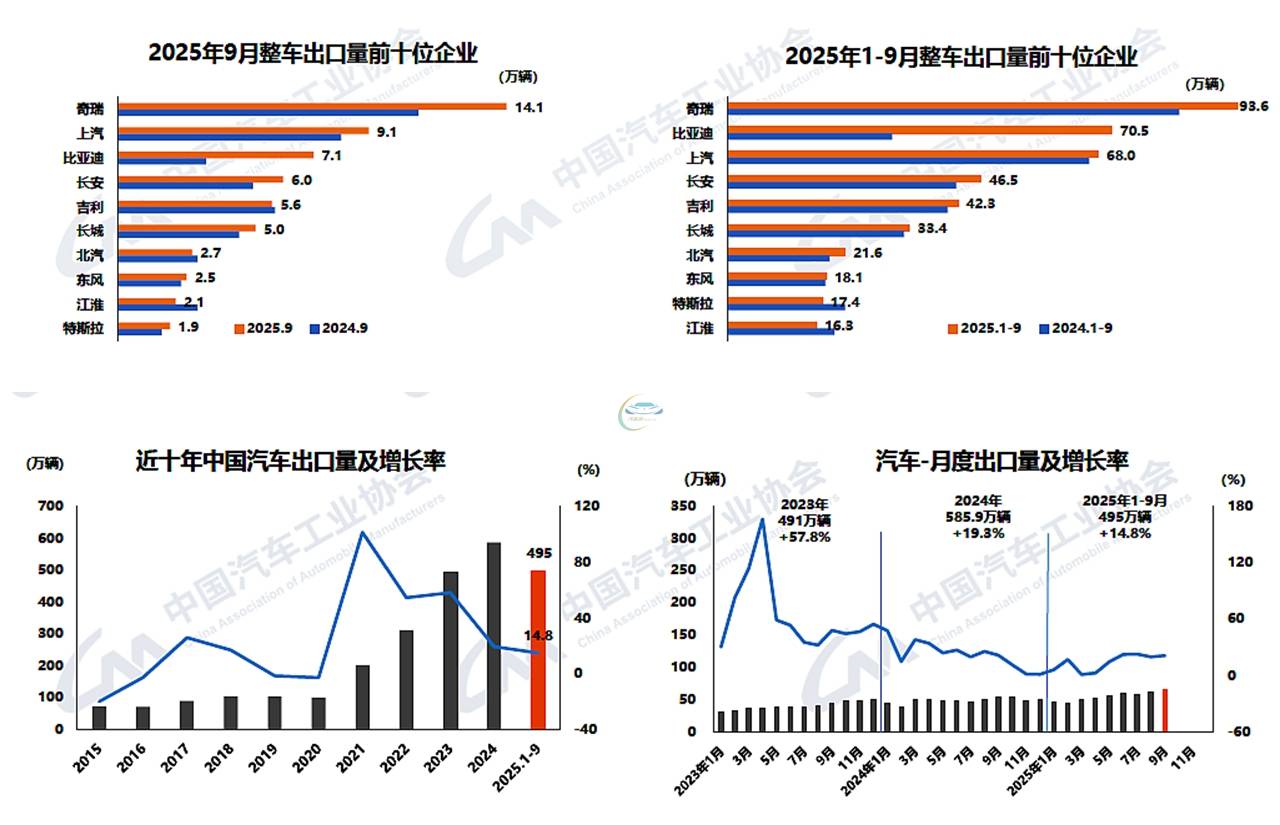 与总体市场连续5个月10%以上增长“同乐”,汽车出口也保持了稳定增长行情:9月,汽车出口65.2万辆,环比增长6.7%,同比增长21%。1-9月,汽车出口495万辆,同比增长14.8%。
