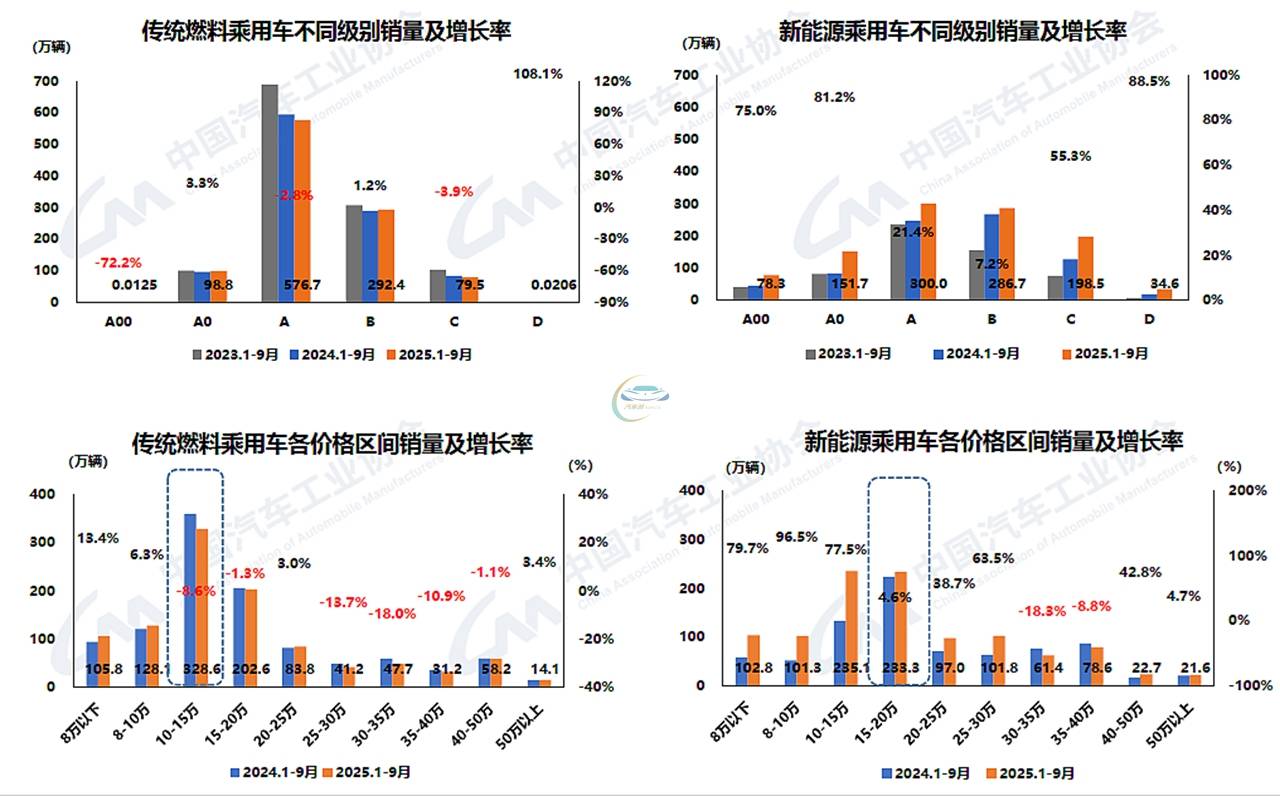 提到新能源车占比,感觉是无限贴近50%,但始终没迈过这个“槛”,究其原因还在于传统燃料汽车的销量,也在同步增长——9月传统燃料乘用车国内销量100万辆,比去年同期增加6万辆,环比增长10.9%,同比增长6.4%,累计来看,传统燃料乘用车1-9月销量814.1万辆,比去年同期增加13.6万辆,同比增长1.7%。