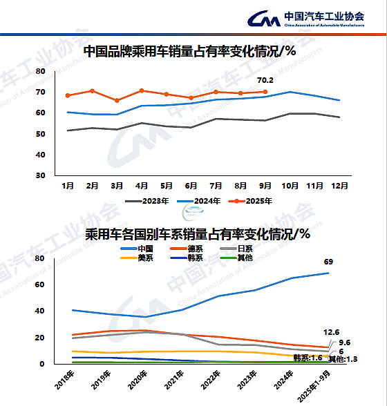 另一个数据亮点来自国别系表现:9月份,中国品牌乘用车销量占比一举突破70%,单月销量200.7万辆,同比增长17.4%,市占率提升2.5%。1-9月中国品牌乘用车共销售1465.1万辆,同比增长22.9%,销量占有率提升了5.1%达69%,即10位购车消费者之中,有7位入手了中国品牌新车。