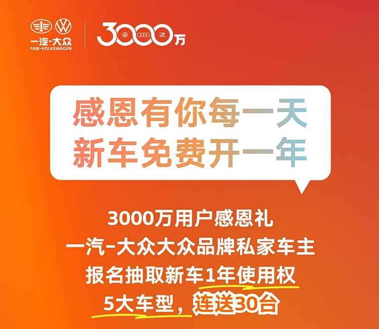 作为“3000万感恩季”的重头戏,一汽-大众特别了推出“新车免费开一年”抽奖活动。