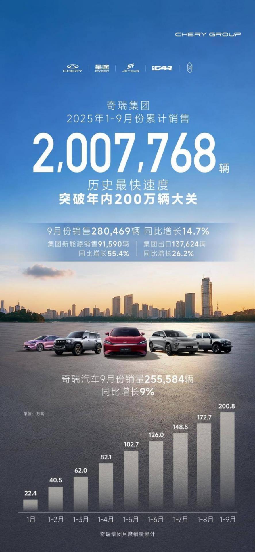 当年的每一句质疑,最终都成了奇瑞“来时的路”上最清晰的记忆。2025年前三季度,奇瑞集团销售超过200万辆,打破奇瑞历史最快速度突破年内200万辆大关,创历史新高!出口93.64万辆,持续保持中国汽车出口第一!新能源汽车58.75万辆,增速位居行业前列!这张漂亮的成绩单,正是对二十余年质疑声最有力的回应!