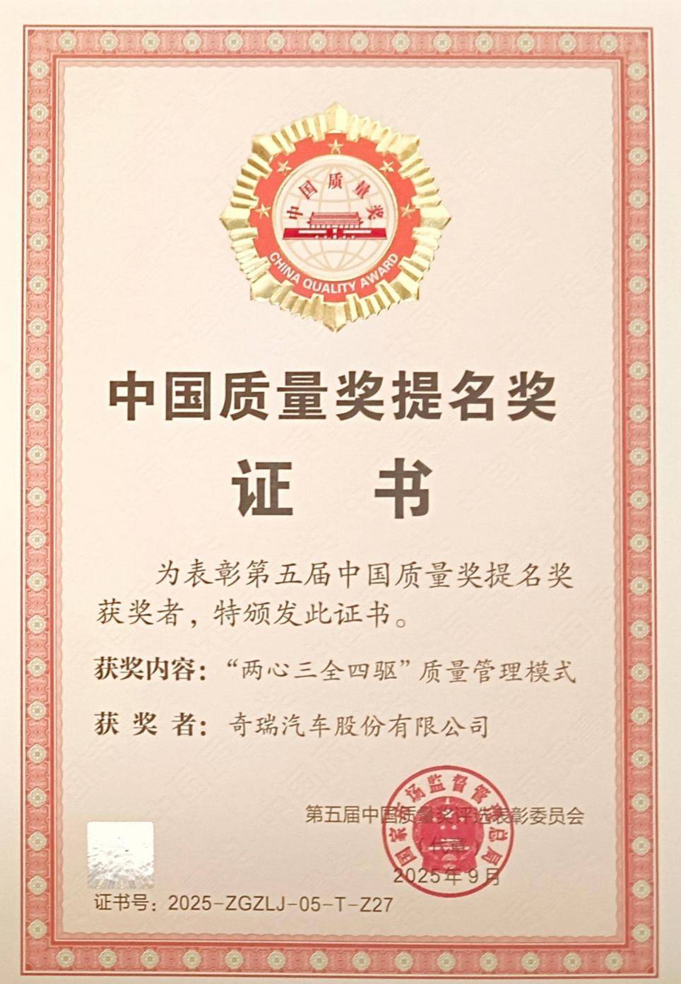 凭借独创的“两心三全四驱”质量管理模式,奇瑞汽车还在9月份获得中国质量领域最高荣誉认可——中国质量奖提名奖。可以说品质与安全,是奇瑞畅行全球的底气所在!