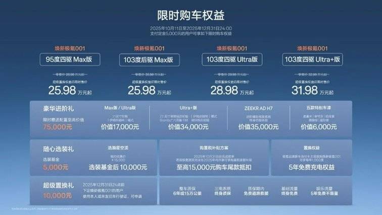 对此极氪还设置了权益调整过渡期,针对2026年1月1日零点前下定焕新极氪001的用户,仍按照原2025款极氪001三电终身质保权益规则执行。