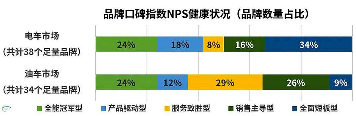究其细节,J.D.Power分析认为,燃油车市场品牌口碑指数由“服务致胜型”(占比29%)和“销售主导型”(占比26%)品牌主导,口碑稳定;而新能源汽车市场品牌口碑指数NPS中,虽然“产品驱动型”(占比18%)表现卓越,但“全面短板型”占比高达34%,该类品牌不仅自身品牌口碑指数NPS极低,还会因为用户体验差(如品控差、售后无门)而拉低新能源汽车行业的平均品牌口碑指数NPS,影响消费者对新兴品类的信任。