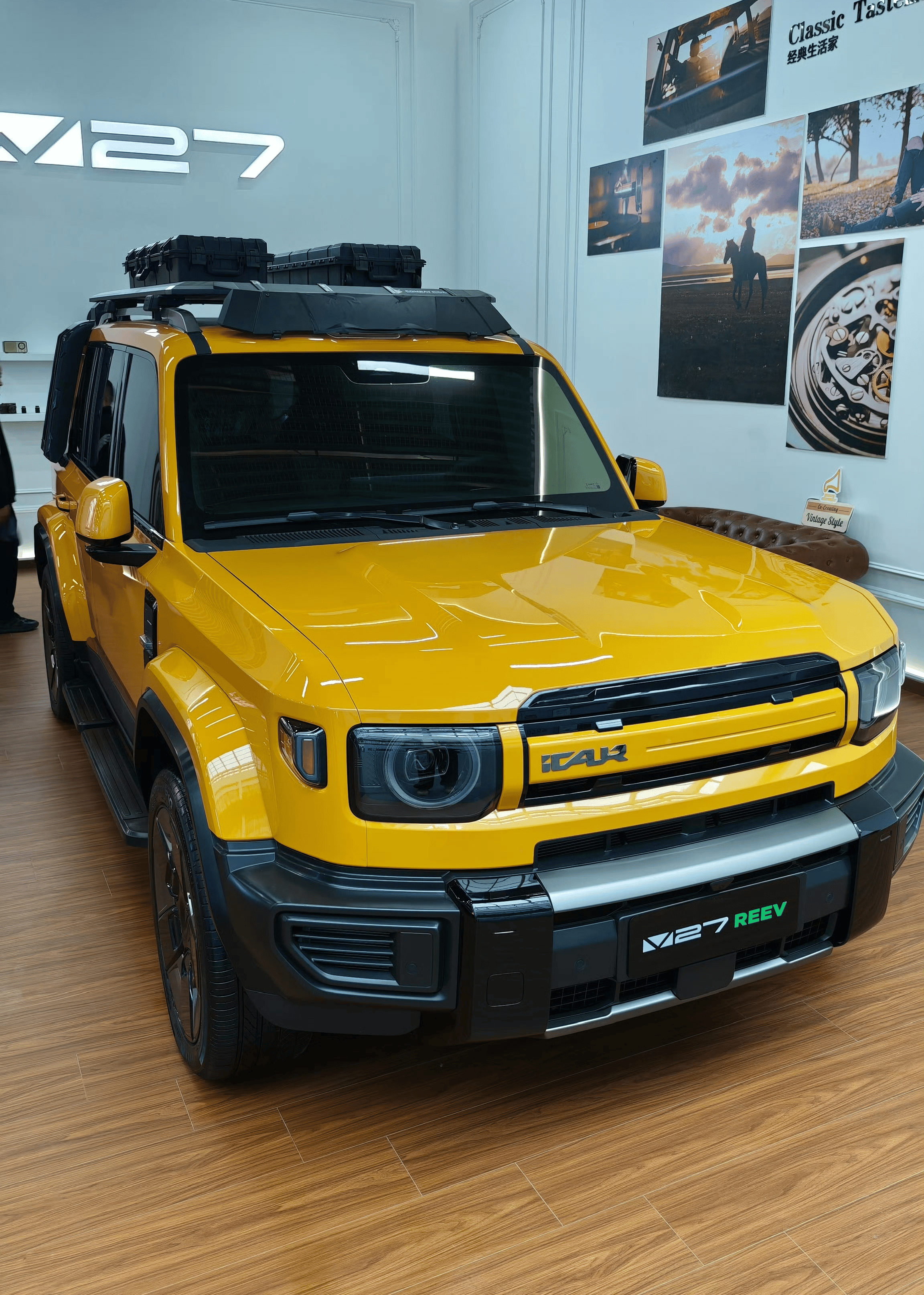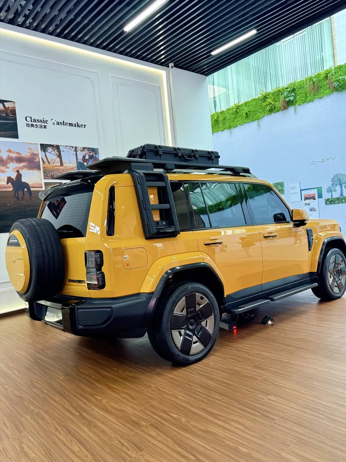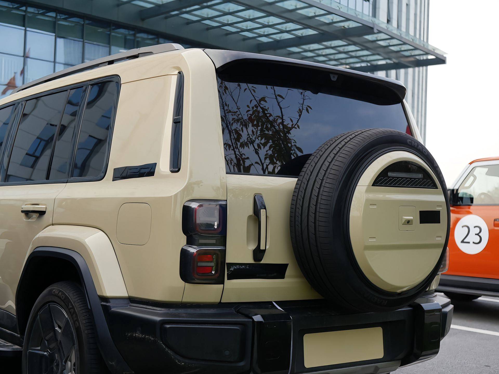 而黄色涂装配合D柱盲窗、21英寸双色五辐式轮毂等,又带来了时尚、前卫属性,并提供外挂式备胎或“小书包”储物箱可选。尾部的竖置双方形尾灯组同样借鉴了路虎卫士的设计风格,侧开式尾门则继续强调硬派越野的身份,底部粗犷的熏黑后包围与前脸相呼应。