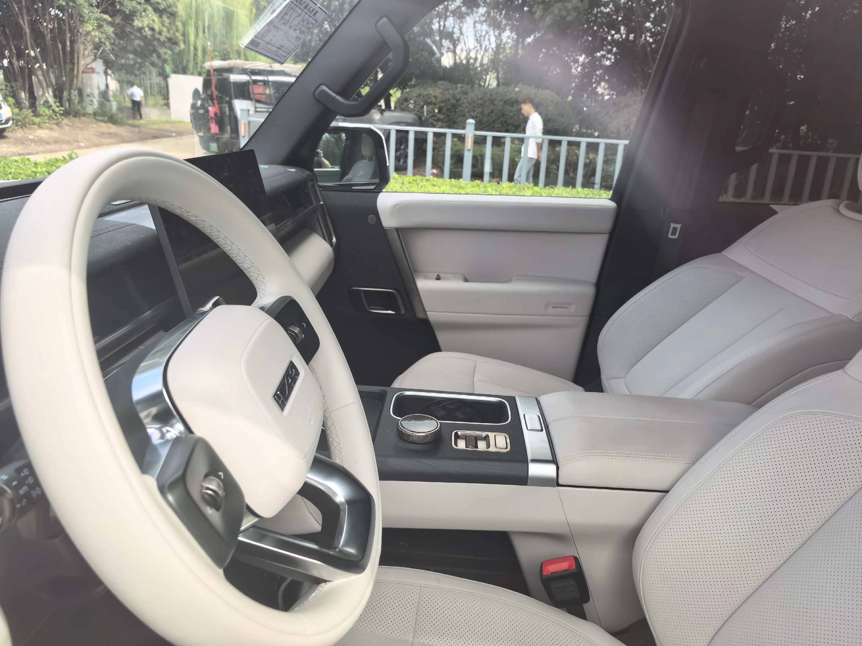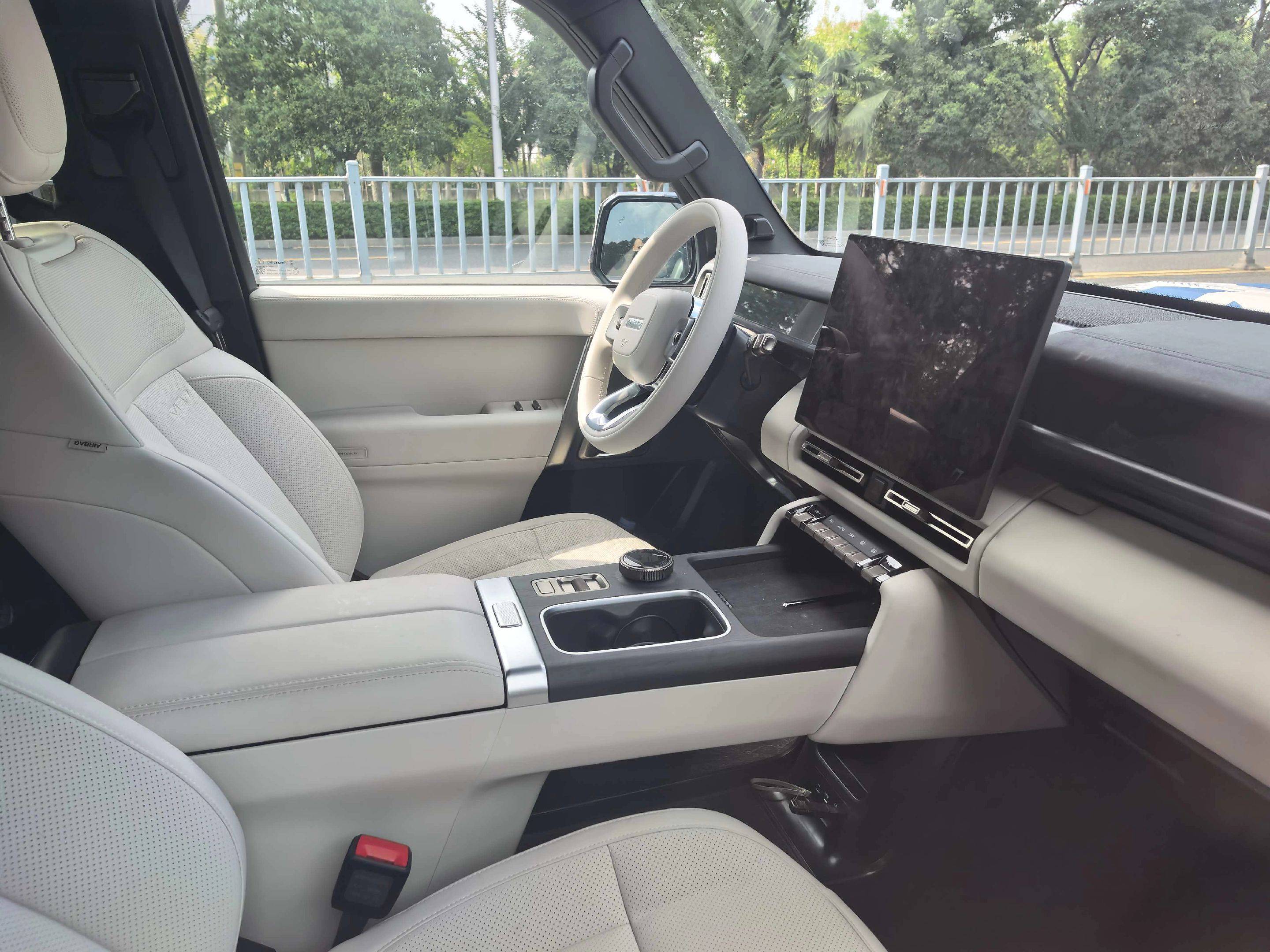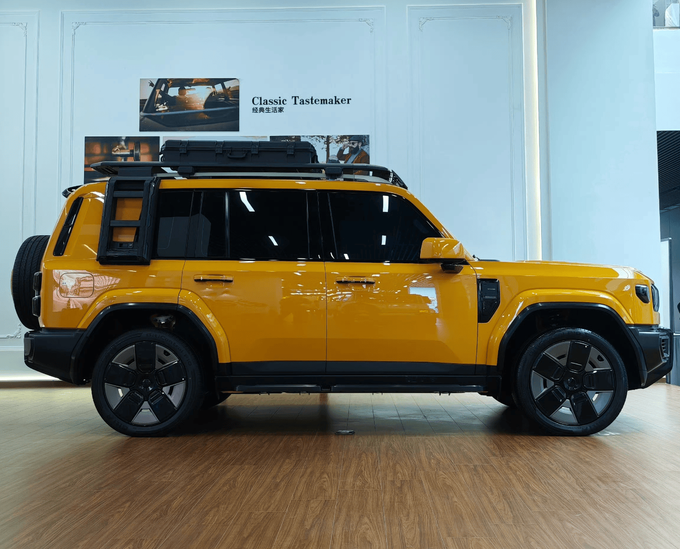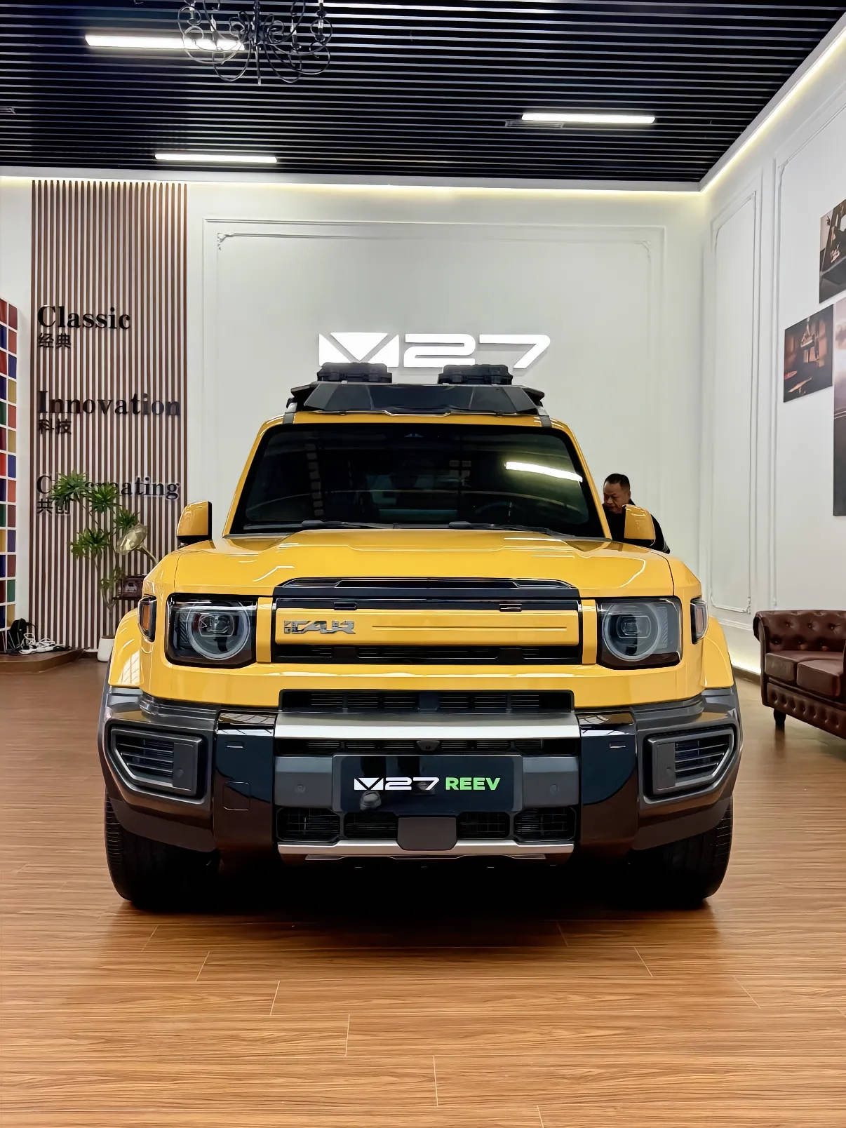而黄色涂装配合D柱盲窗、21英寸双色五辐式轮毂等,又带来了时尚、前卫属性,并提供外挂式备胎或“小书包”储物箱可选。尾部的竖置双方形尾灯组同样借鉴了路虎卫士的设计风格,侧开式尾门则继续强调硬派越野的身份,底部粗犷的熏黑后包围与前脸相呼应。