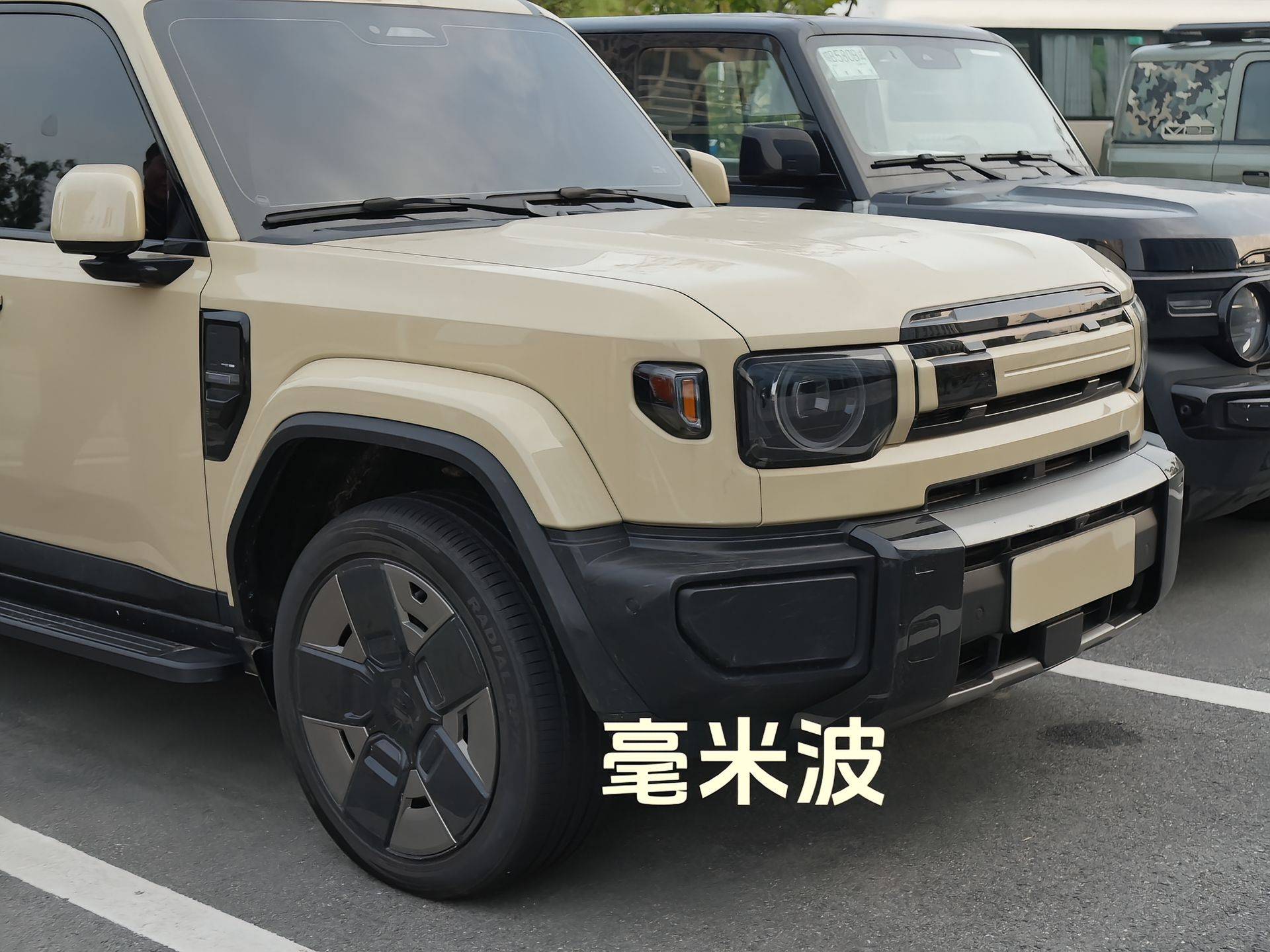 车身尺寸长宽高分别为5055(4909)/1976/1855(1894)mm,轴距2910mm,相比路虎卫士110(车长5018mm)更大一些。车身侧面采用“方盒子”造型,加之棱角分明的宽体轮眉、固定式脚踏板、车顶行李架以及拓展越野套件等,硬汉属性显露无遗。