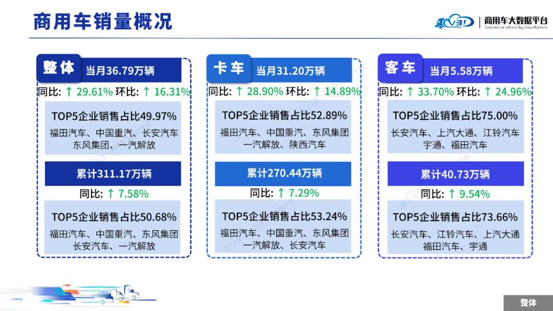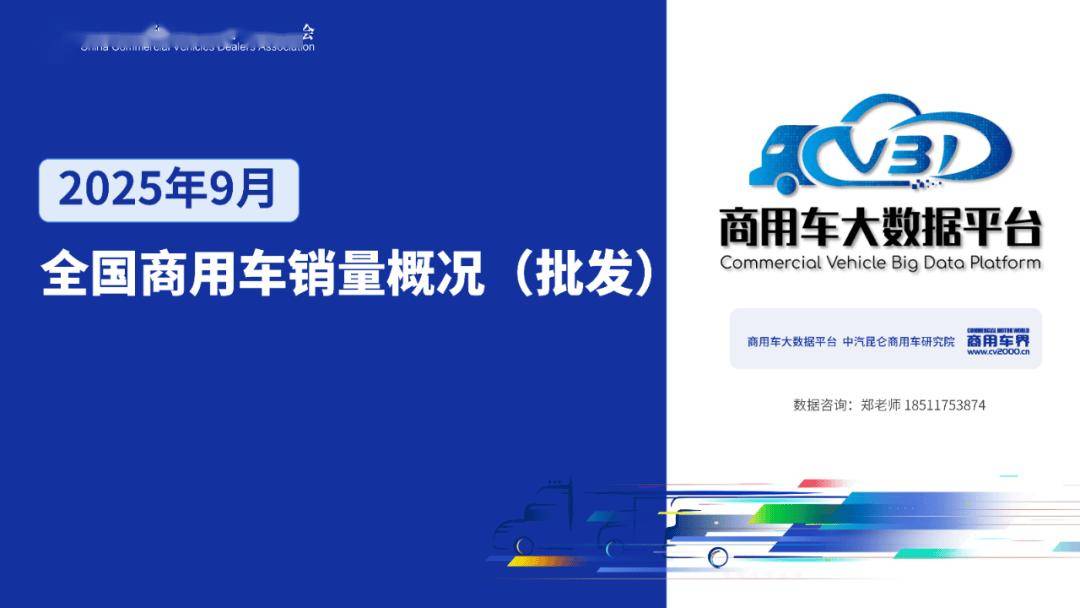 2025年9月全国商用车整体销量(批发)为36.79万辆,同比增长29.61%,环比增长16.31%;1-9月全国商用车累计整体销量(批发)为311.17万辆,累计同比增长7.58%。