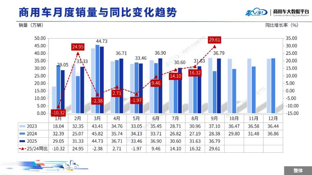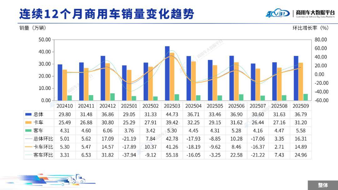2025年9月全国商用车整体销量(批发)为36.79万辆,同比增长29.61%,环比增长16.31%。