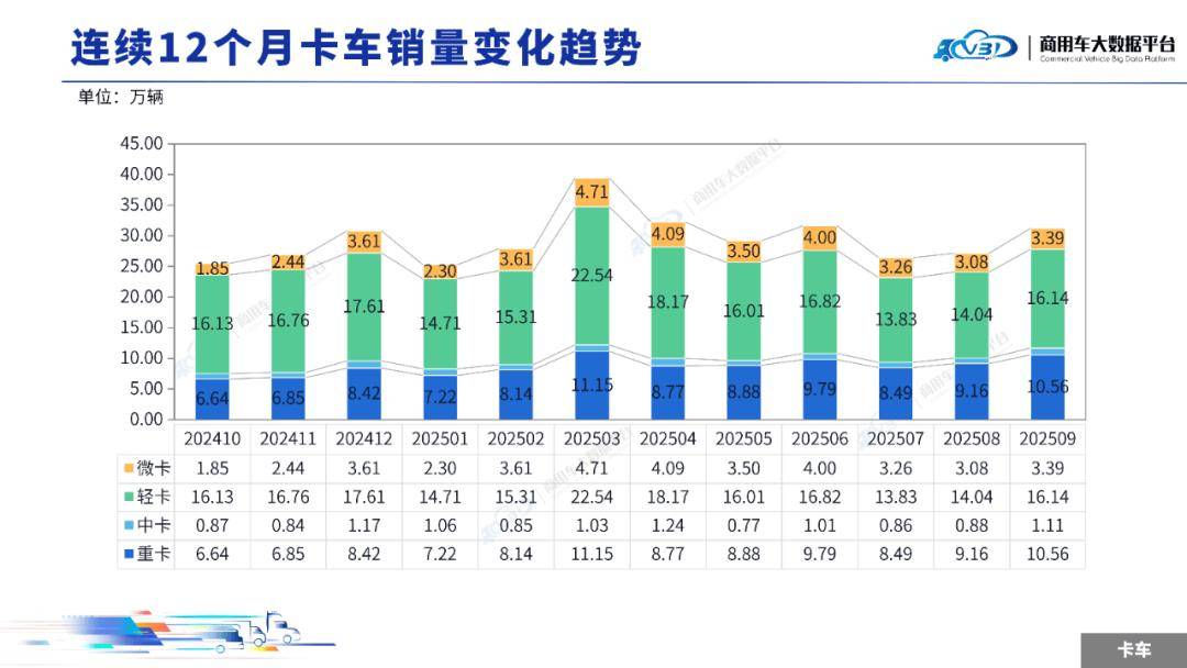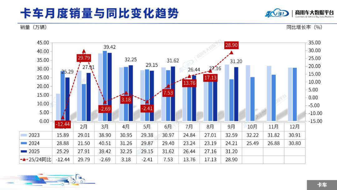 2025年9月卡车销量(批发)为31.20万辆,同比增长28.90%,环比增长14.89%;1-9月卡车累计销量(批发)270.44万辆,同比增长7.29%。