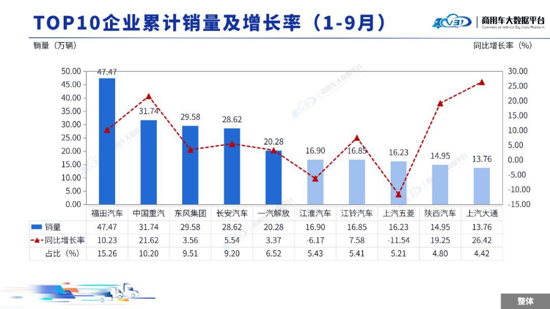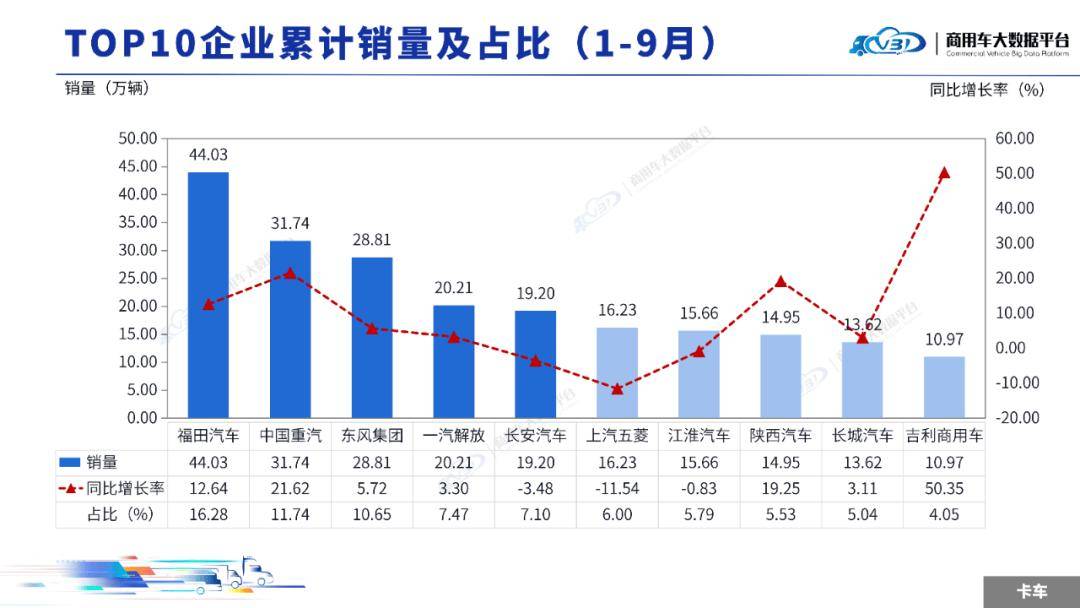 1-9月累计TOP5企业销量占比为50.68%,依次为福田汽车、中国重汽、东风集团、长安汽车、一汽解放。