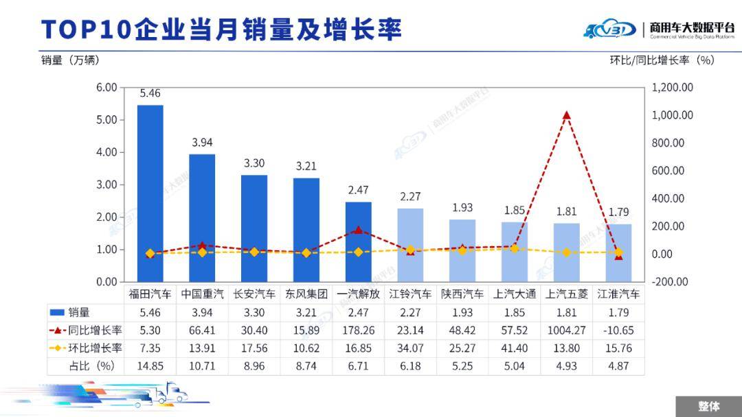 当月TOP5企业销量占比为49.97%,依次为福田汽车、中国重汽、长安汽车、东风集团、一汽解放。