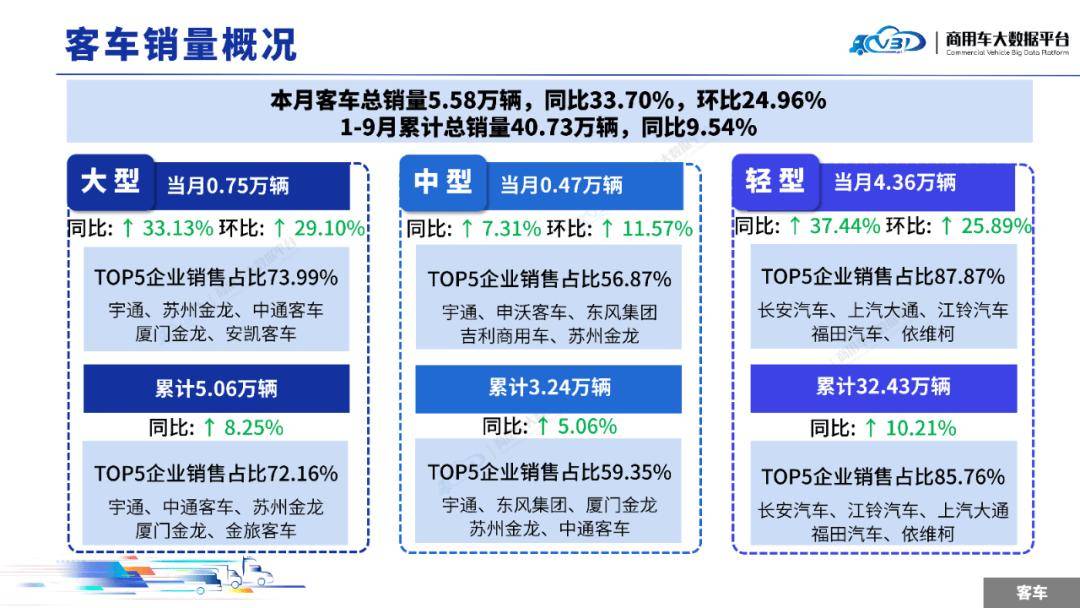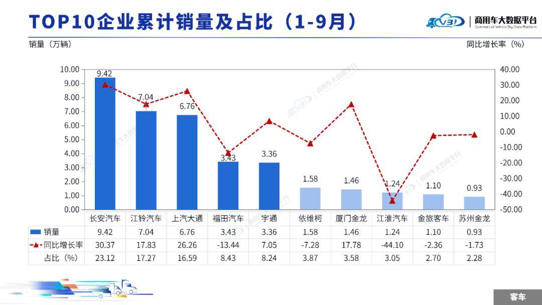 1-9月客车TOP5企业销量占比为73.66%,依次为长安汽车、江铃汽车、上汽大通、福田汽车、宇通。