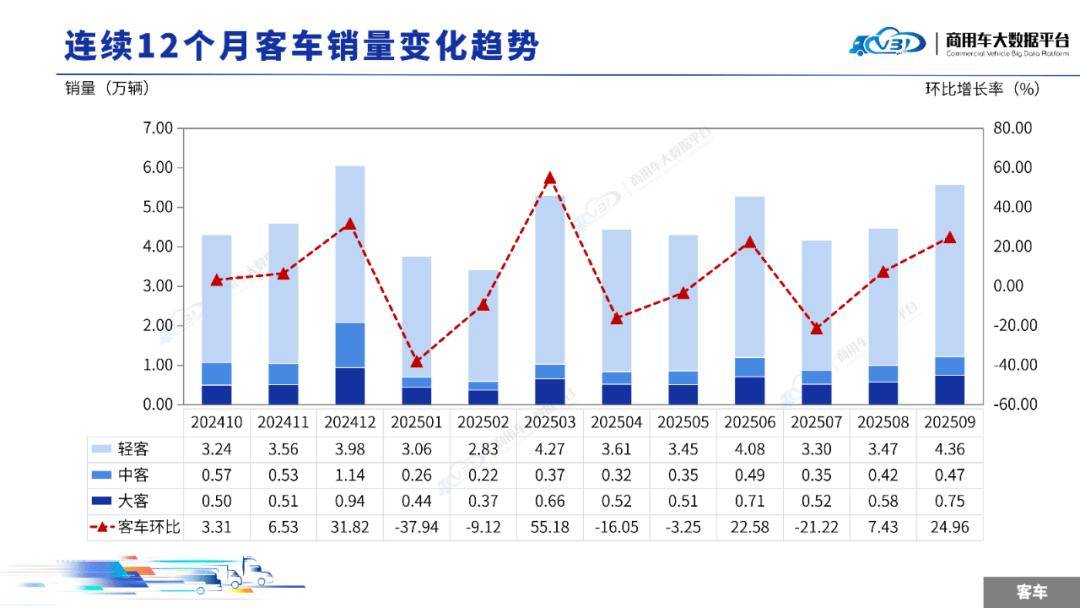 2025年9月客车销量(批发)为5.58万辆,同比增长33.70%,环比增长24.96%;1-9月客车累计销量(批发)40.73万辆,同比增长9.54%。
