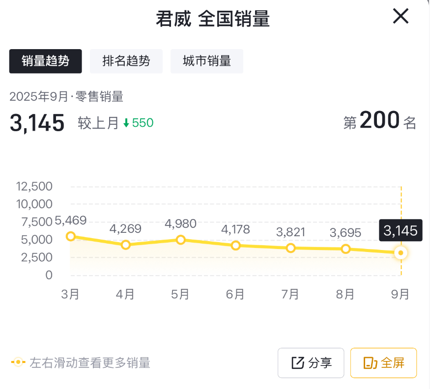 显然,从2025年6月份开始,截止到2025年9月份,别克君威的单月零售销量已经连续四个月环比走低了。