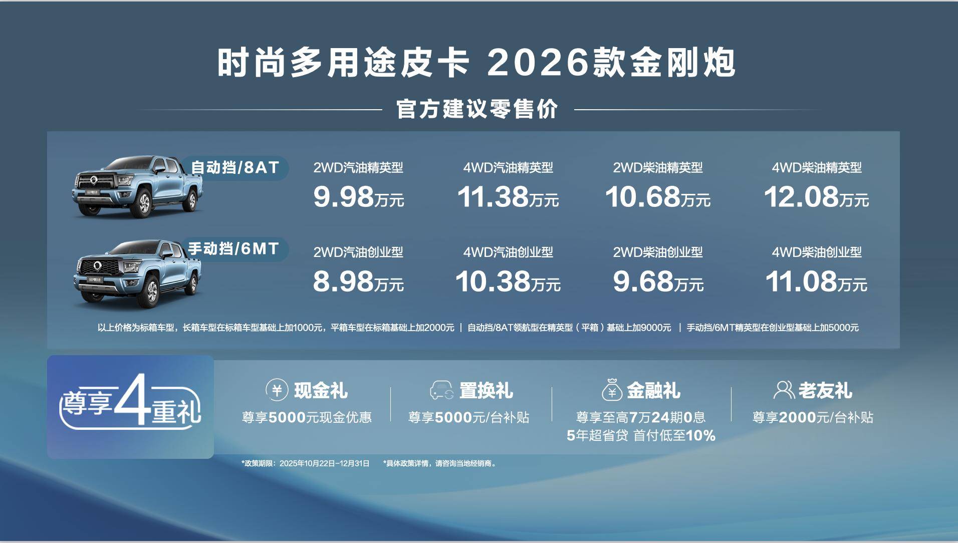 在第10万辆金刚炮整车下线的同时,2026款金刚炮正式上市,官方指导价8.98-12.08万元,涵盖汽油/柴油、两驱/四驱、标箱/长箱、手动/自动8个版本。提供5000元现金优惠、5000元置换补贴、2000元老友礼,7万24期0息等多项购车权益。此次改款主要在实用配置、动力系统和装载能力上进行了升级。