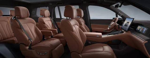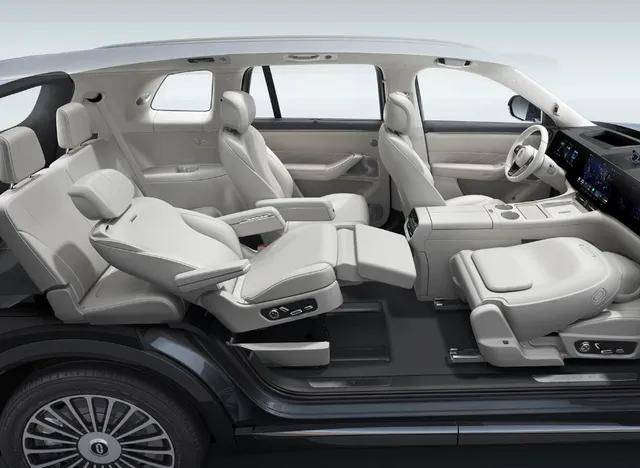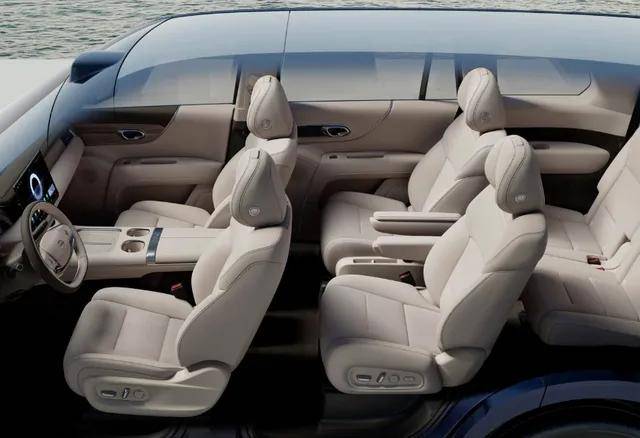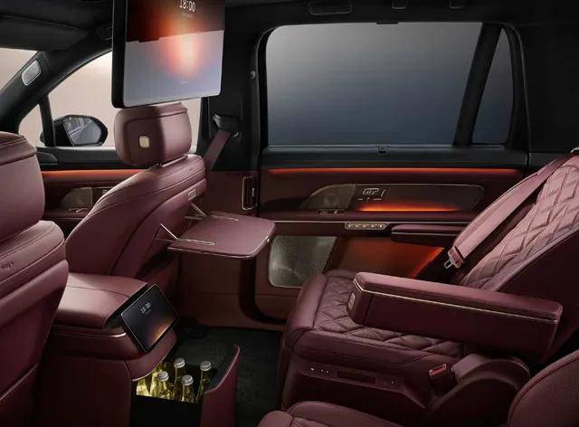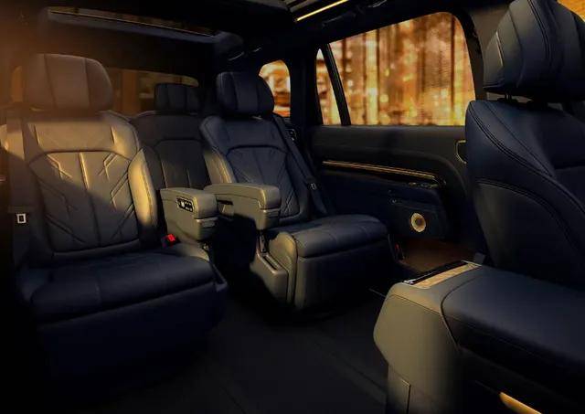 车辆提供6座和7座版本,第三排座椅也带有加热功能,小桌板、控制屏、后排娱乐屏、磁吸接口、车载冰箱等配置一应俱全。