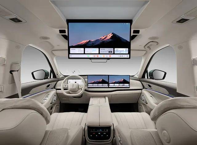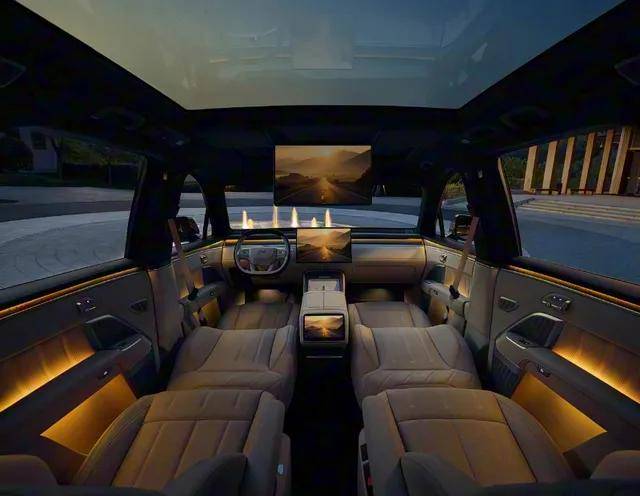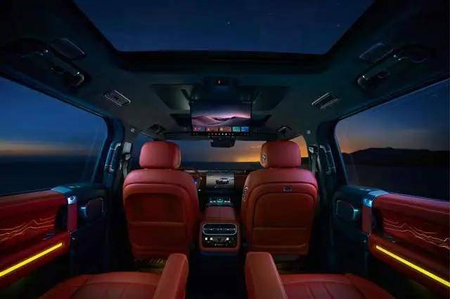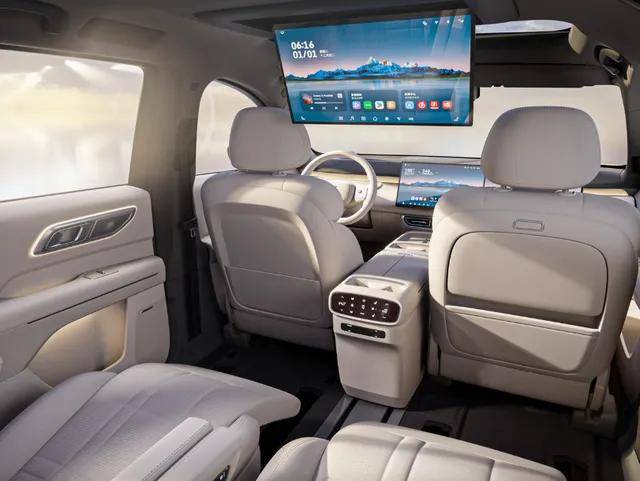 车辆内部,同样是精致的存在。16英寸双联屏分辨率达到3.5K,还有47英寸的抬头显示。在内部配饰上,木纹饰板、水晶旋钮等,处处都是高级感。车辆第二排零重力座椅支持180°旋转,座椅顶部还配有17英寸飞翼式滑移屏。