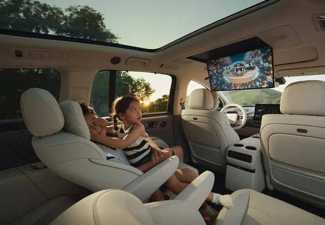 此次车辆在后排新增了一块21.4英寸的娱乐屏,可电动调节。车辆内部走的是家庭、育儿路线,加入了儿童专属AI精灵,互动性较强。
