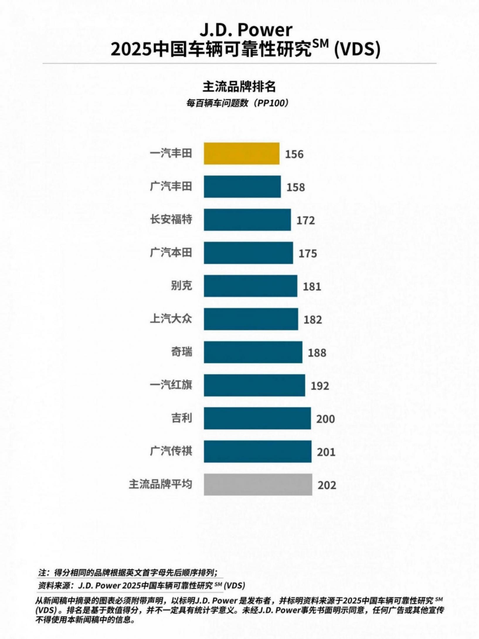 一汽丰田(156个PP100)荣获主流品牌可靠性第一。广汽丰田(158个PP100)和长安福特(172个PP100)分列主流品牌第二和第三。