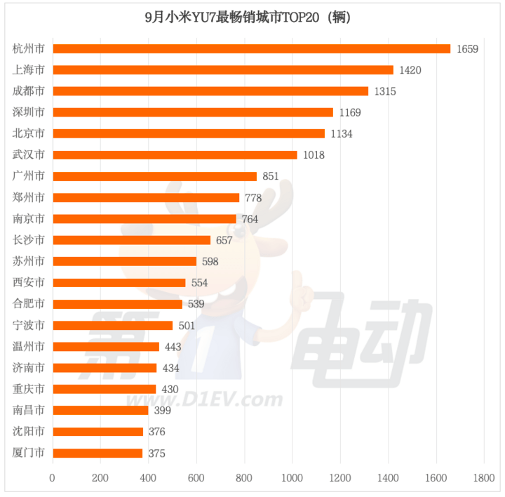 杭州市以1659辆的销量登顶榜首,成为YU7 9月最畅销的城市。