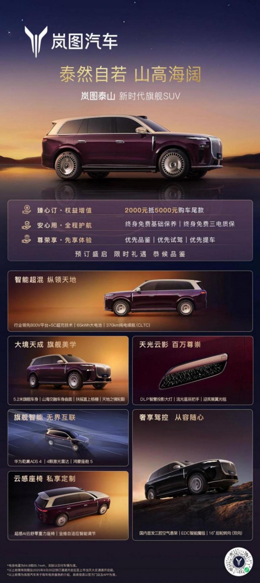 此前,岚图泰山已经开启预售,官方并未公布新车价格,但已推出包括2000元订金抵扣5000元尾款、终身免费保养、三电终身质保等多重尊享权益。